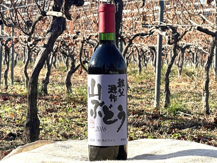 日本の山野に自生するヤマブドウの中から、秩父山系両神地方の気候風土に適したクローンを選抜し、永年にわたり自園において栽培している。樹精が強いので樹冠管理等の作業に苦労が多いが、収穫されたブドウ果実は果皮が濃赤色で、果汁の糖度と酸度がともに高いうえ種子の渋みが豊かである。発酵に先立って4℃で7日間の低温醸しを行うことにより渋みの収斂性(しゅうれんせい)を抑制するとともに、主発酵に引き続きフランス原産のオーク樽内で、刺激の鋭いリンゴ酸を口当たり柔らかい酸味の乳酸に変換するマロラクティック発酵を生起させ、ヤマブドウの品種特性香を活かした濃醇な風味をもつ個性的な赤ワインを造った。ピザをはじめチーズの風味を生かした料理や焼肉との相性が素晴らしい。