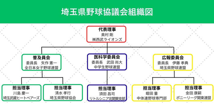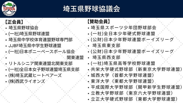 加盟団体には、埼玉武蔵ヒートベアーズ、埼玉西武ライオンズをはじめ、高校野球連盟、少年野球団体、中体連、女子野球など、幅広い野球組織が加わっています。 -
