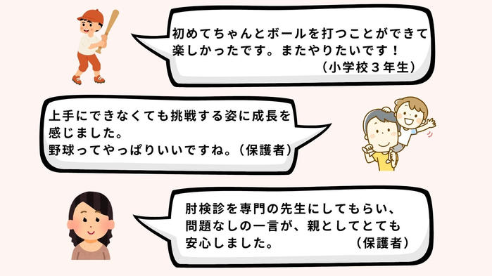 野球を続けたい子どもたちが、安心してプレーできるように、この検診を、これからも継続し、さらに多くの地域へ広げていきます。