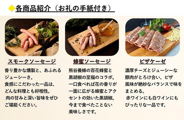 原材料:豚肉(埼玉県)、蜂蜜、食塩、黒胡椒/リン酸塩(Na、K)、調味料(アミノ酸)、酸化防止剤(V.C)、発色剤(亜硝酸Na)、(一部にそば・豚肉を含む)