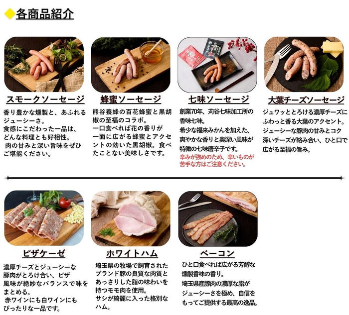 【ギフト梱包・のし対応】12月23日(火)までのご注文まで年内発送いたします。年始は1月6日(火)以降順次発送いたします。お歳暮や年末年始のご挨拶、お年賀にぜひ。【セット内容】スモークソーセージ120g、蜂蜜ソーセージ120g、七味ソーセージ120g、大葉チーズソーセージ120g、ピザケーゼ110g、ホワイトハム110g、ベーコン110gの7種セット。【発送】冷凍発送【消費期限】1か月【注意事項】七味ソーセージは、辛みが強いため、辛いものが苦手な方はご注意ください。