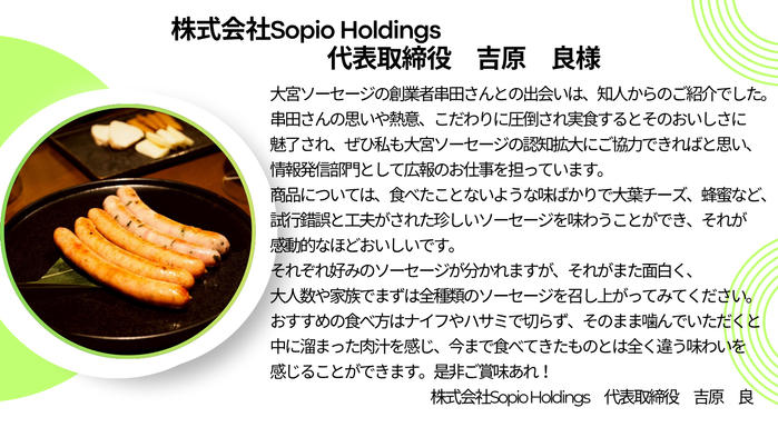 『大宮ソーセージ』を通して、地域の人と産業が笑顔でつながる未来をつくれるよう励んでまいりますので、これからもどうぞ応援をよろしくお願いいたします。