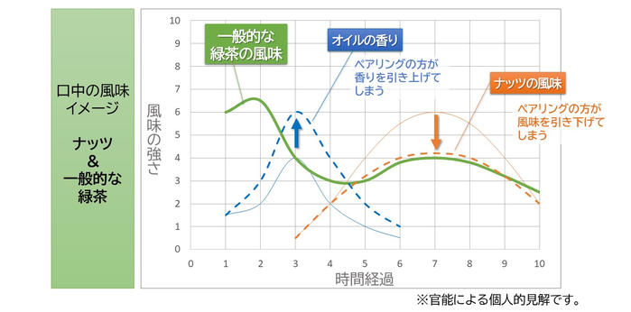 - 一方、一般的な緑茶は、フレッシュグリーンな香り(青い香り)と後口の苦渋みが持ち味。その青い香りがオイルの香りを際立たせやすく、更に、すっきりした味わいがナッツの風味(とくに甘み)を抑えてしまうため、相性が良いとは感じにくいのです。