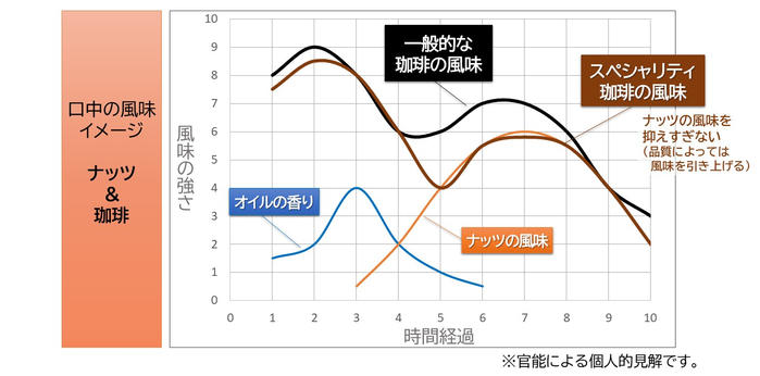 - 珈琲はロースト香が強く、この“オイルの香り”を包み込みます。特に、優しいロースト香と果実のような香り、爽やかな酸味が広がるスペシャリティ珈琲は、オイルの香りを抑えつつもナッツの甘みを引き立たせる好相性の代表例です。