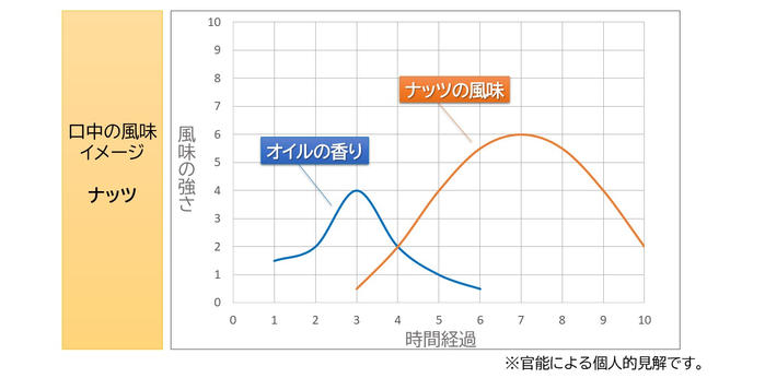 じっくりと甘みとうま味を引き出す抽出方法によりナッツとのペアリングを試してみると、バニラを思わせる甘い蘭の花のような香りが口の中に充満し、見事にオイルの香りを包み込んでくれました。 -