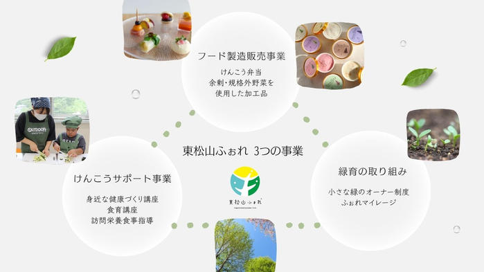 長年にわたり地域の緑を守り、環境と向き合ってきた造園業の歩みと価値観を礎に、管理栄養士としての専門性を重ね、フード製造販売事業、けんこうサポート事業、緑育の取り組みを主事業として展開しています。