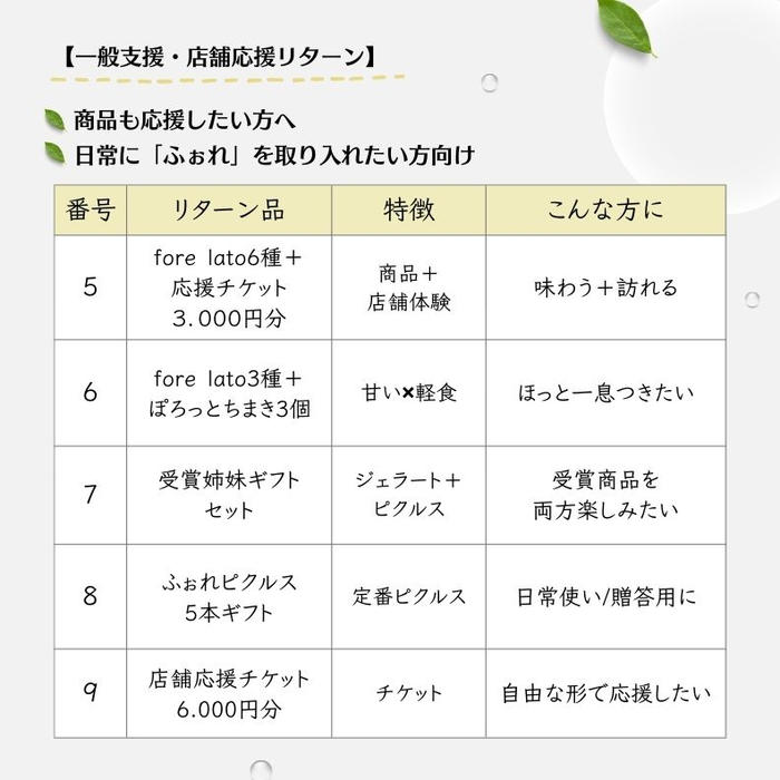 “味わう”“訪れる”“応援する”。『forelato』だけでなく、ふぉれという場そのものを楽しんでいただけるリターンです。 -