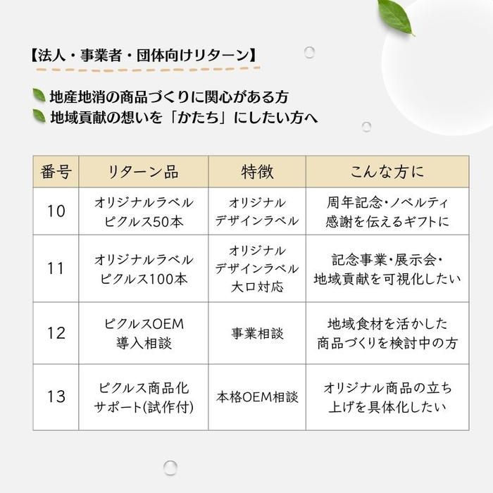 - ⑩の内容を拡張した、企業・団体向けの大口プランです。オリジナルラベルを施したピクルスを100本お届けします。