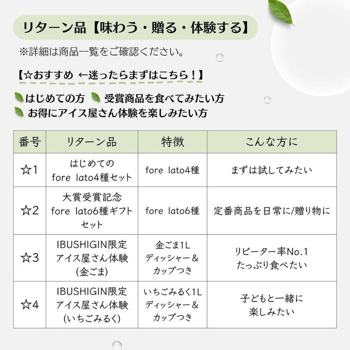 「次もこれ」と選ばれることの多い、リピーターに愛されてきた定番フレーバー。ディッシャーとカップ付きで、ご自宅が“アイス屋さん”に。『forelato』の世界観を体験できる、IBUSHIGIN限定の特別なリターンです。 -