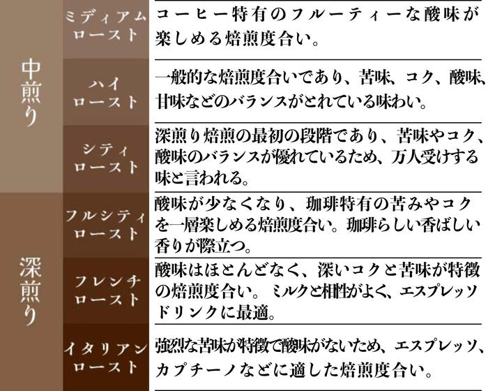 - 焙煎度とは、コーヒー豆をどれくらいの深さまで煎ったかを示すものです。